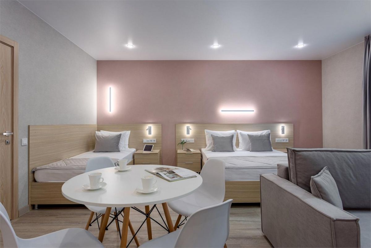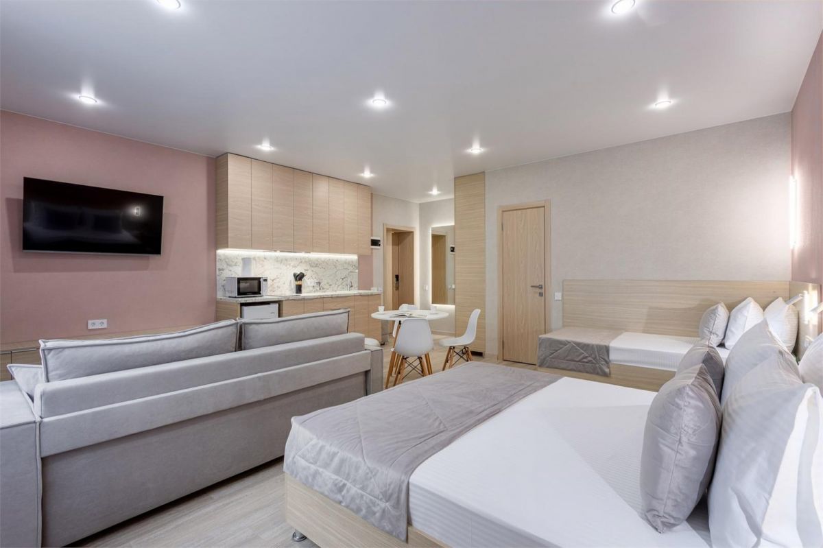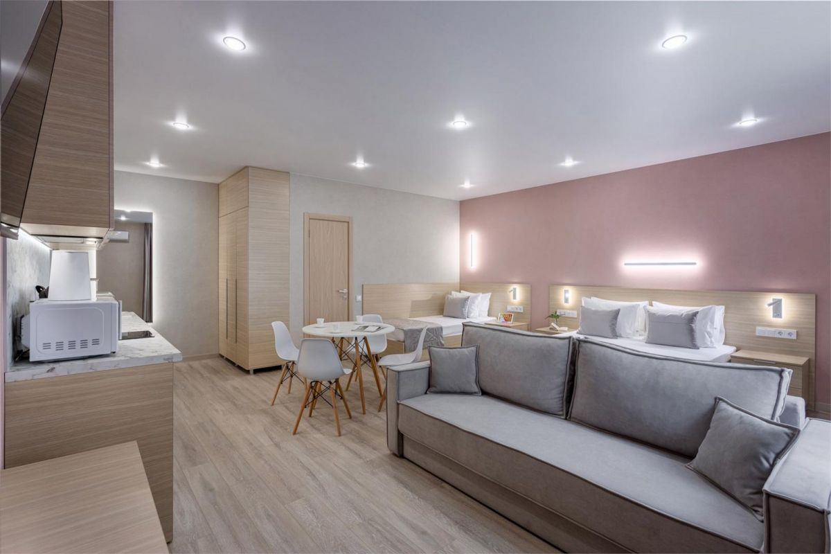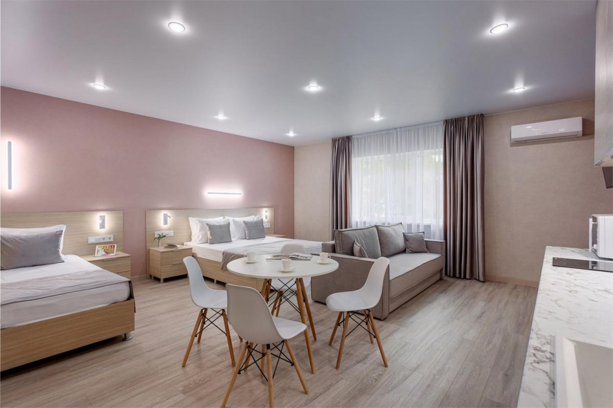 Полулюкс -это удобный просторный номер , предназначен для семейного отдыха. Этот вариант отличается комбинацией удобства и функциональности, что делает его отличным выбором для семейных каникул. В номере оборудованы комфортабельные спальные места для всей семьи в одной комнате, одна большая кровать для родителей и одна полноценная кровать для взрослого или ребенка , а также большой раскладной диван для еще одного путешественника. В номере есть своя небольшая лаунж зона для семейного время провождения или просмотра интересного фильма. На кухне есть все необходимое для приготовления пищи: обеденный стол и стулья, варочная панель с вытяжкой, холодильник посуда и столовые приборы. Площадь номера -32 кв.м. Есть встроенная кухня. Оснащение: Одна большая кровать Queensize, одна отдельная кровать 160*190 см. прикроватные тумбочки, большой, мягкий диван, журнальный столик, пуфик вместительный шкаф «купе», кондиционер, телевизор, электронные замки. Санитарная комната оборудована современными сантехническими устройствами имеет стильный и функциональный дизайн, удобная душевая кабина, шкафчики для хранения косметических принадлежностей, широкий умывальник, чистые полотенца. В комплект каждого гостя входит: