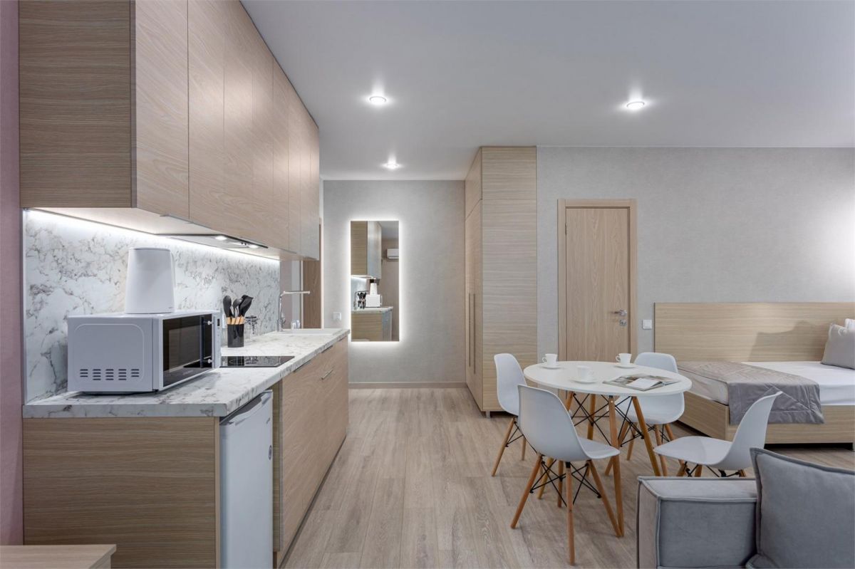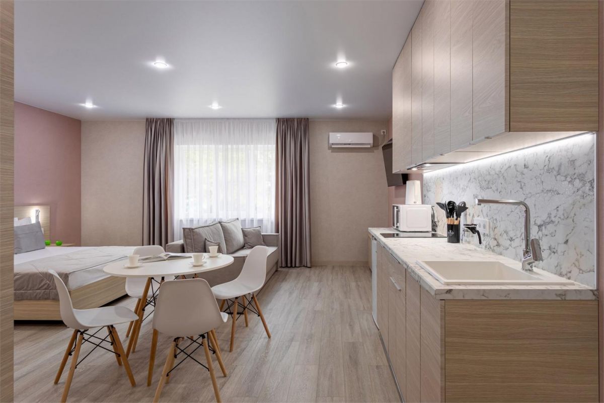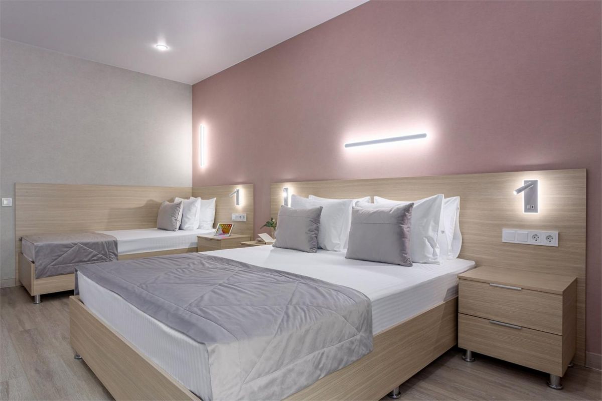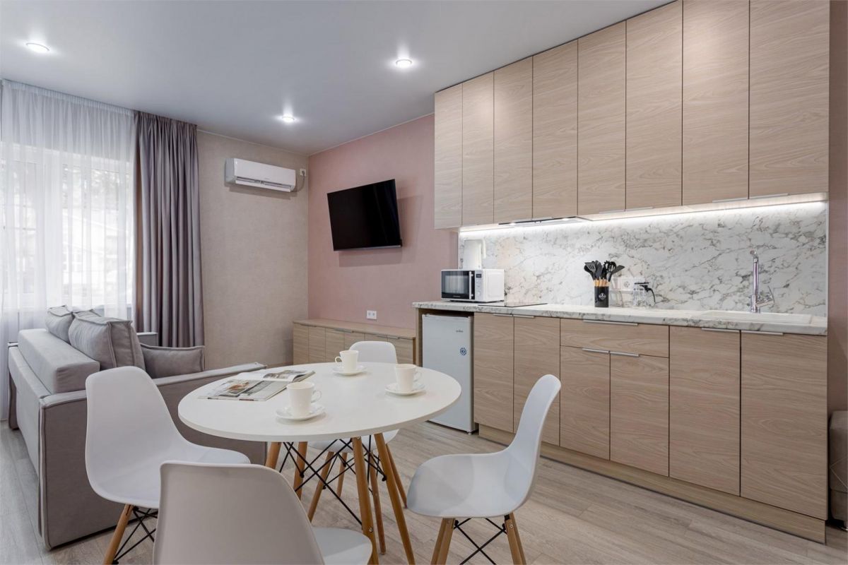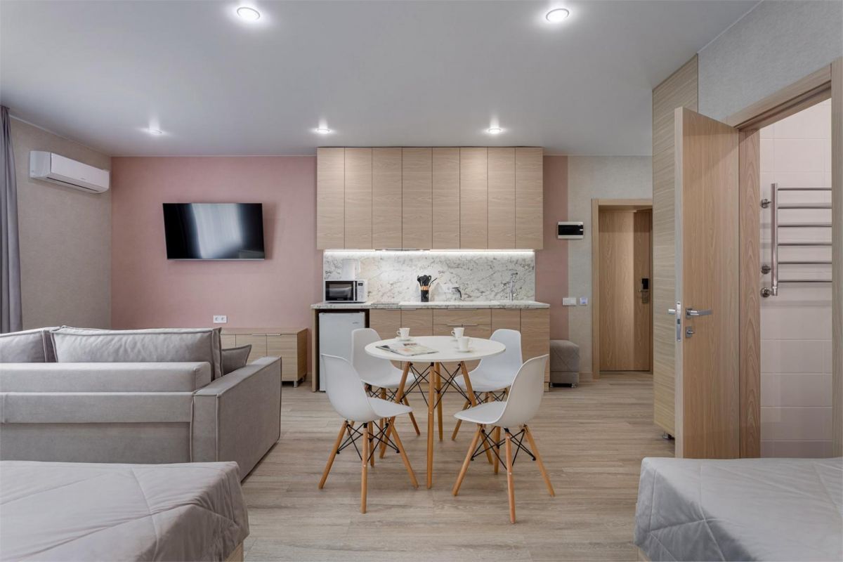 Полулюкс -это удобный просторный номер , предназначен для семейного отдыха. Этот вариант отличается комбинацией удобства и функциональности, что делает его отличным выбором для семейных каникул. В номере оборудованы комфортабельные спальные места для всей семьи в одной комнате, одна большая кровать для родителей и одна полноценная кровать для взрослого или ребенка , а также большой раскладной диван для еще одного путешественника. В номере есть своя небольшая лаунж зона для семейного время провождения или просмотра интересного фильма. На кухне есть все необходимое для приготовления пищи: обеденный стол и стулья, варочная панель с вытяжкой, холодильник посуда и столовые приборы. Площадь номера -32 кв.м. Есть встроенная кухня. Оснащение: Одна большая кровать Queensize, одна отдельная кровать 160*190 см. прикроватные тумбочки, большой, мягкий диван, журнальный столик, пуфик вместительный шкаф «купе», кондиционер, телевизор, электронные замки. Санитарная комната оборудована современными сантехническими устройствами имеет стильный и функциональный дизайн, удобная душевая кабина, шкафчики для хранения косметических принадлежностей, широкий умывальник, чистые полотенца. В комплект каждого гостя входит: